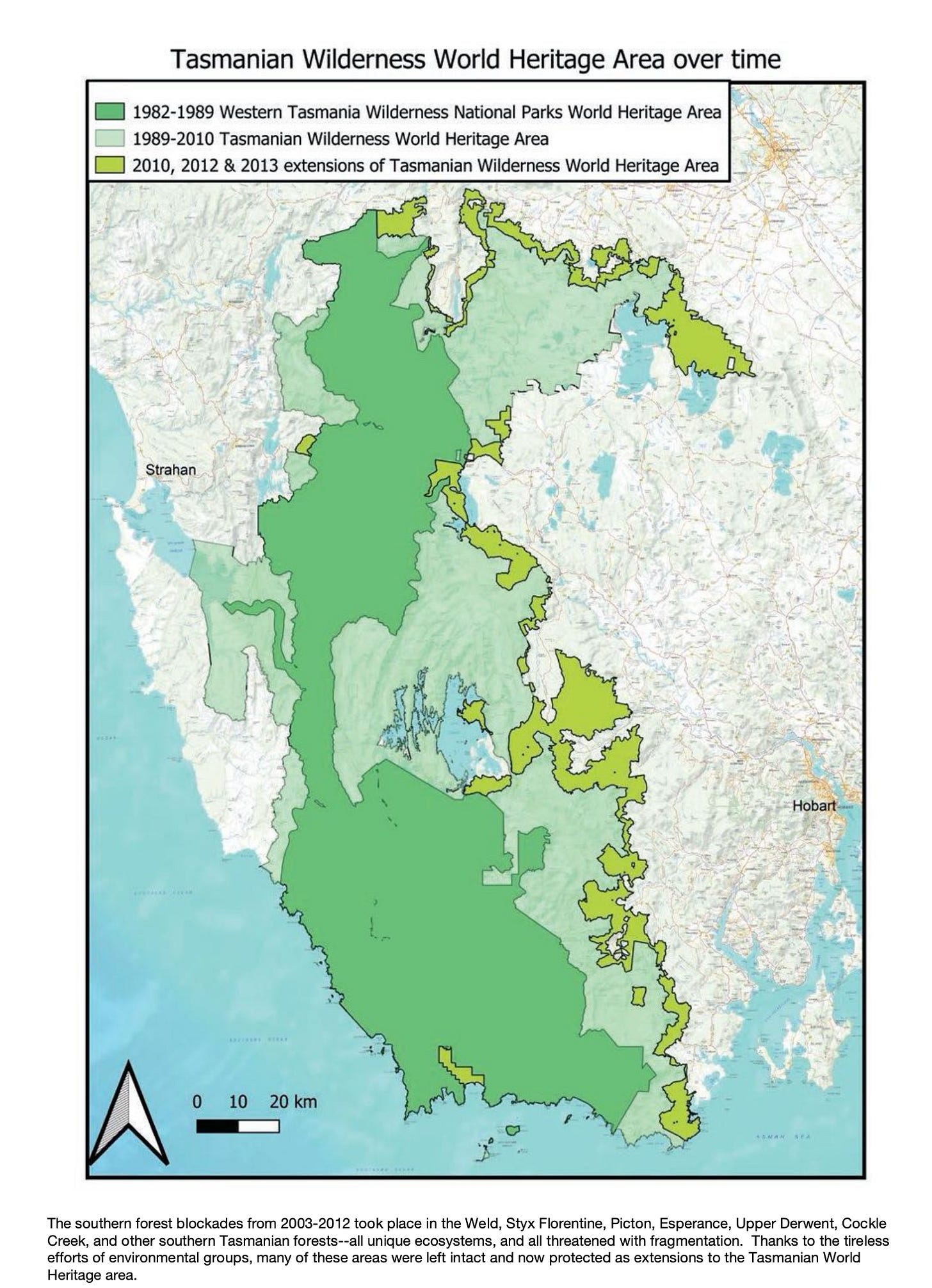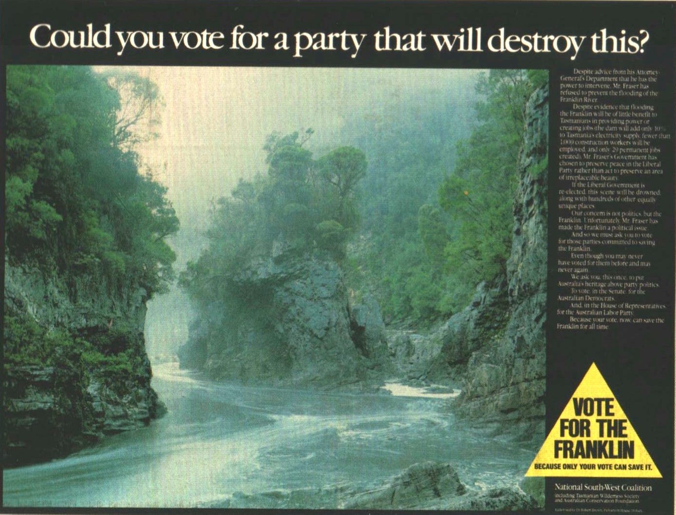 Amongst the groups peacefully protesting and risking arrest for the Australian wilds, ecotage tactics were purposely abandoned and alternate strategies of non-violent direct action (NVDA) were pursued, as long as there were mechanisms in place that ensured that protestors’ lives were not recklessly endangered, as they had been in the 1979 Terania protest. Campaigns were organised with police liaisons, compulsory NVDA training, and organised control of protesting sites and media exposure. The three-month blockade that began on December 14, 1982, and interrupted the relentless damming of Tasmania’s treasured wild and scenic rivers was a cumulation of a seven-year strategy that began with the establishment of the Tasmanian Wilderness Society and ended with a new World Heritage Site and protection of the Franklin River, a unique wild-river ecosystem.