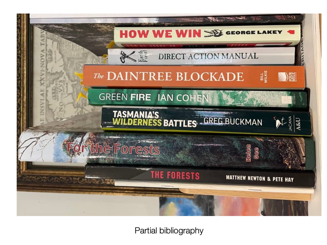The context for this quote is from a conflict inspired a singular act of violence on July 19th, 1976, when John Robert Chester and Michael David Haabjoern attempted to blow up the old growth woodchip terminal in Bunbury. Chester and Haabjoern’s actions resulted in them being sentenced to seven years in prison. These actions crystallised the Campaign to Save Native Forests (CSNF) interest in non-violent, direct action. L.J. Christensen, The Re-Enchanted Forest, Murdoch University, Australia, 2005.