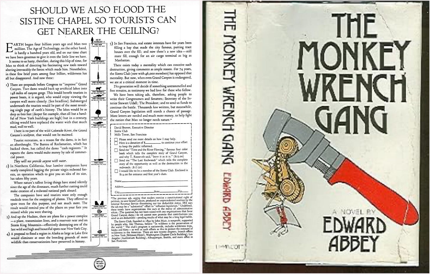 In the southwest USA, Edward Abbey famously inspired activists to employ means of sabotage of wilderness-destroying machinery to slow progress, such as the shearing of bulldozer hydraulic lines, dumping sand in oil and fuel tanks, and other means of temporarily and permanently disabling industrial equipment. The practice became known as "monkeywrenching" or “nightwork”, and the general rule was that violence was not to be directed at people, but machinery and infrastructure were fair game. The use of explosives was mostly fantasized, such as the only way to bring down the hated dam that flooded Glen Canyon, as the potential harm to humans could not be eliminated. Human vs. machine monkeywrenching was popularised by some American environmental groups, such as Earth First! and other groups actioning even more violent tactics, and would continue for decades in America's environmental battles. In the 1990s, actual 'eco-terrorism' was rare, but real in the United States, polarising ecologists in their level of acceptance, and ultimately ineffective in the broader environmental agenda of preservation.2