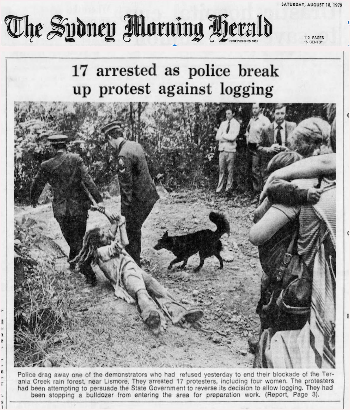 The Nightcap Action Group joined the Franklin blockade and were primarily in the deepest upriver regions of the campaign. Jill McColloch recalls the timing of their upriver blockade (prior to the finish of the Uni term) as critical to the campaign, as “without them, we wouldn’t have been able to start as soon as we did.” In his book, Green Fire, Ian Cohen describes the 'love hearts' action, where crepe-paper chains of hearts were stealthily wrapped around guarded industrial equipment on Valentine's Day in 1983, signalling the message of potential ability of ecotage ("Our message was clear. 'You fear us and accuse of of eco-terrorism. We could sabotage. We have the ability but choose not to."). Of the police reaction to Franklin, Cohen writes, "For many of them it was an 'other worldly experience'. They had never encountered the nonviolent philosophy and accompanying forest strategies. The normally quiet backwaters of Tasmania reverberated with peaceful yet confronting communication." The subsequent Daintree blockades in Queensland are also examples of alternate strategies of cat and mouse protesting, with treesits as a core blockading tactic.