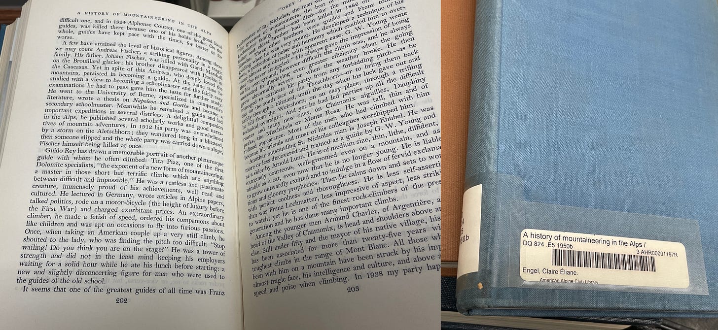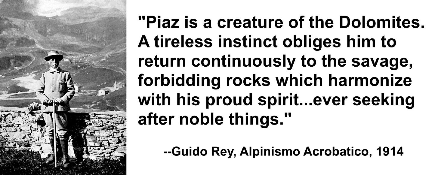 Piaz’s attitude toward the acceptable use of pitons and his attitudes toward risk become more clear reading his recollections, as well as his published statements during the famous “Piton Dispute” of 1911-1913. In a nutshell, Piaz felt life was more important than bravado, and he deeply lamented Preuss’s death, as well as many “double falls” (when a falling leader also rips the belayer to their death). A well-translated and illustrated version by Randolph Burks of the piton debates can be read here. Jim Erickson’s excellent summary here.