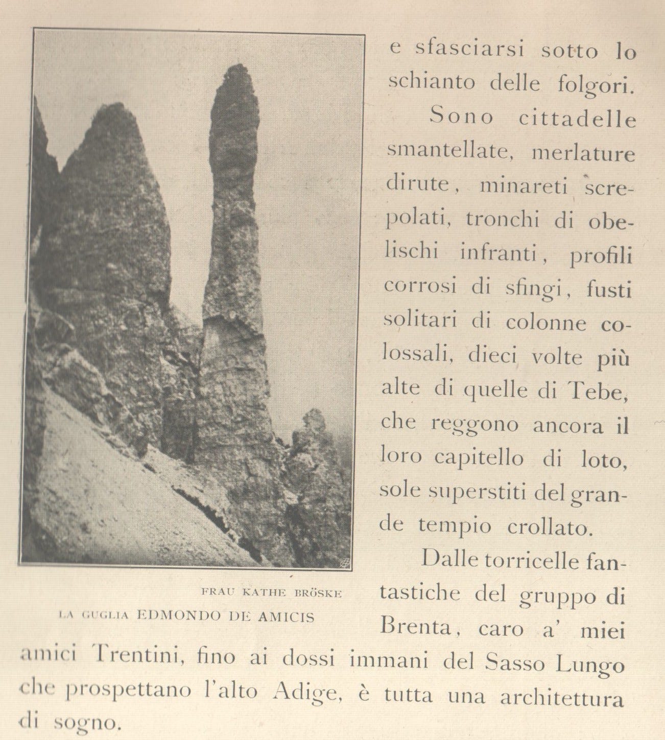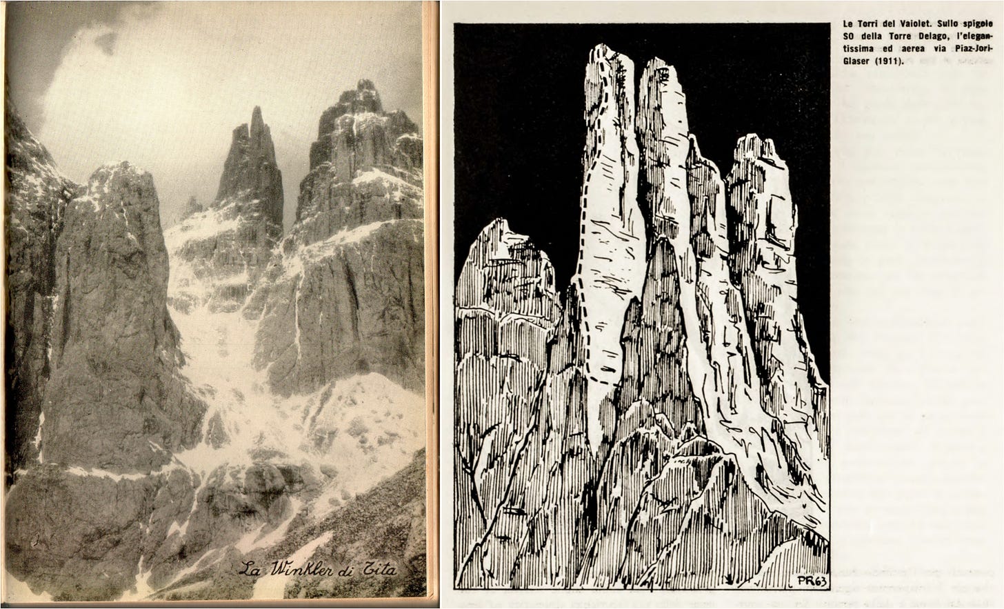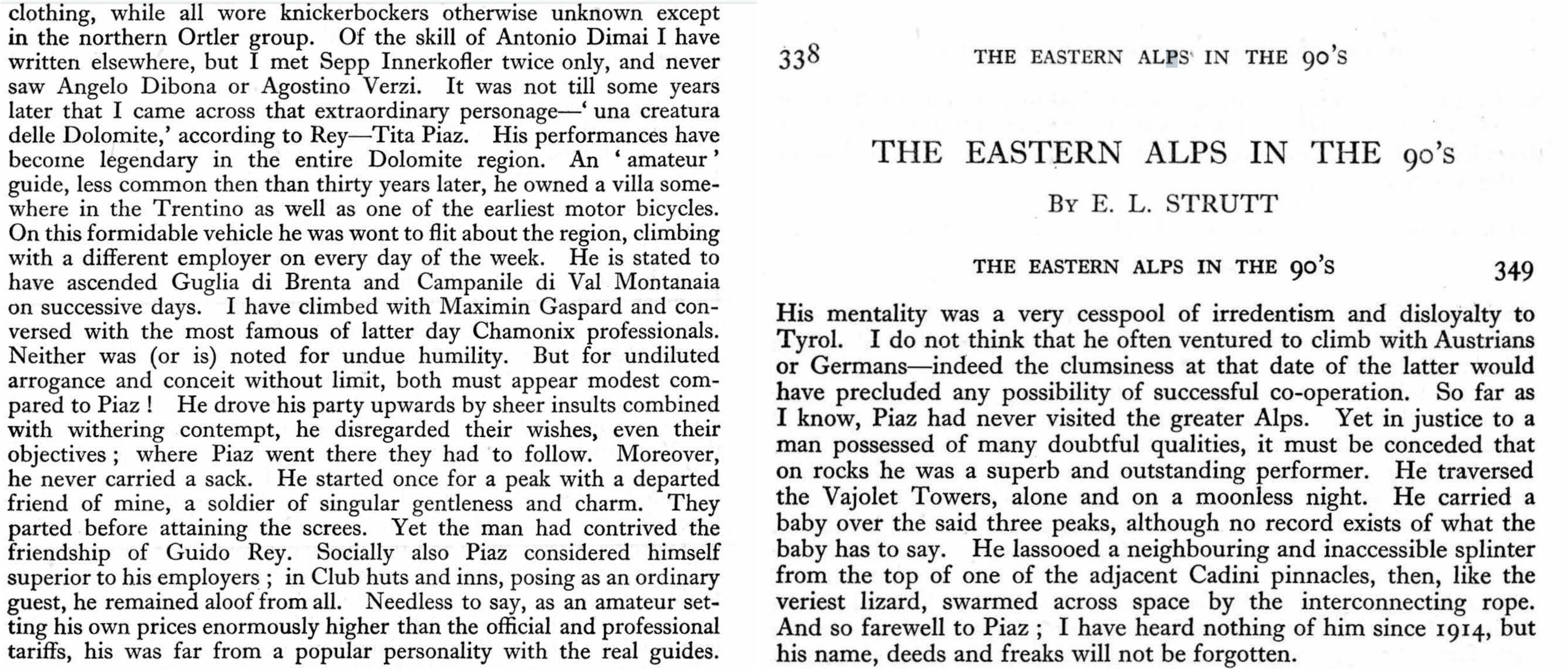 “With a quick movement, Piaz climbs and disappears. Immediately I am ordered to follow, as obedient as a schoolboy, I imitated as best I could the movements I had seen, then came a fierce struggle between me and the rock, groping here and there with hands and feet. Half suffocated, I begged for advice, and I do not remember if it was thanks to Piaz’s advice or to the rope, I soon found myself face to face with Piaz--it was then that I really learnt to know Tita.”