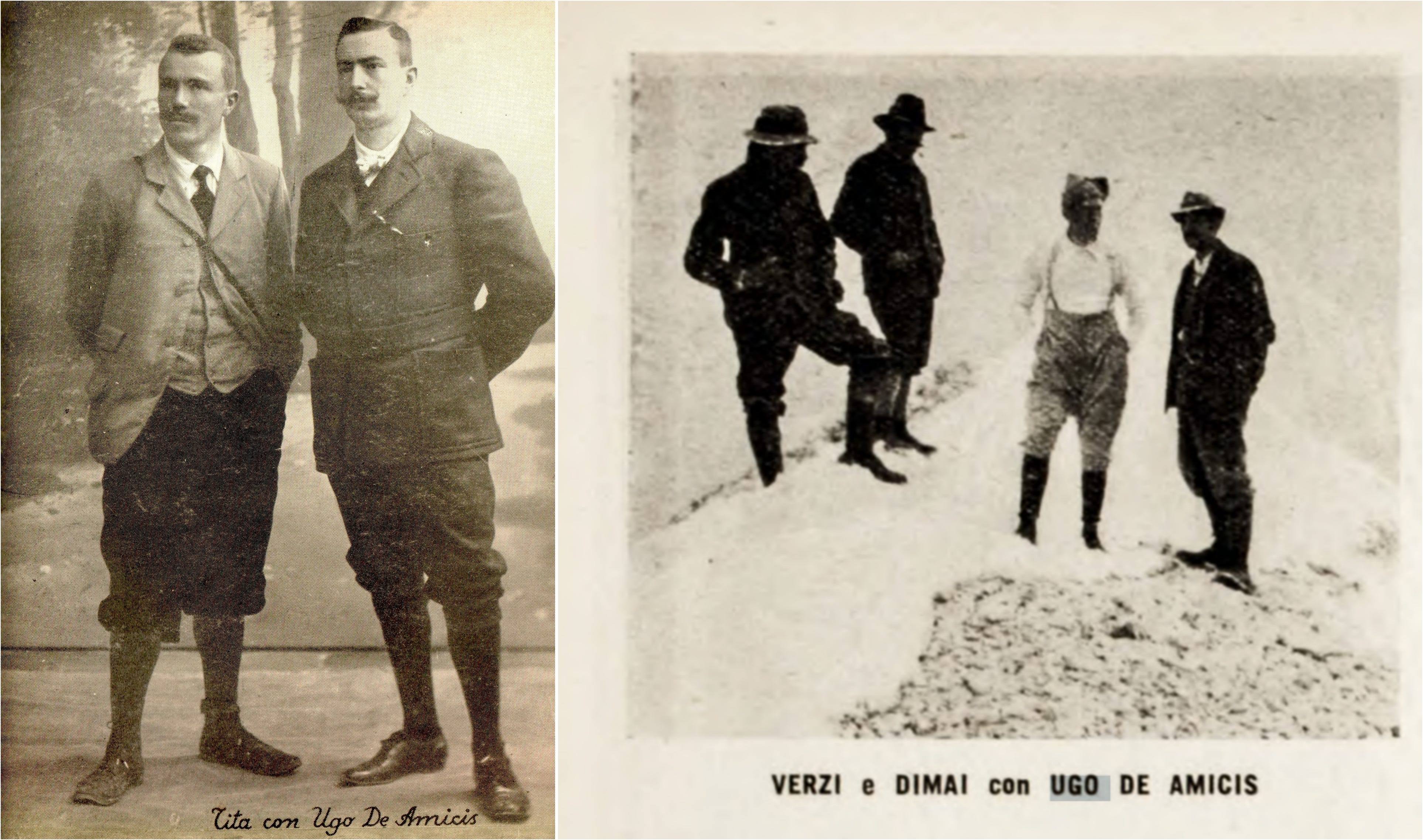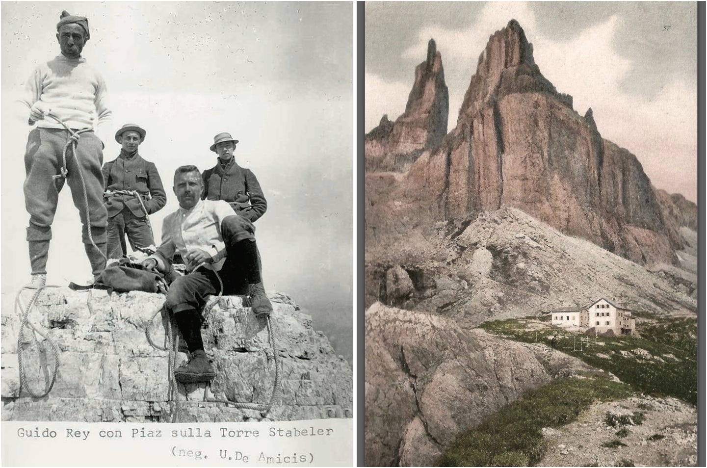 After dedicating Guglia de Amicis to his favourite irredentist author, Piaz sent photos of the spire to Ugo de Amicis, Edmondo’s son, who had been actively climbing in the Western Alps. Ugo immediately got in touch with Piaz and made plans for the wild rope ride across to the summit of Guglia de Amicis for the 1907 guiding season. Ugo knew of Piaz’s reputation as “one of the most daring and victorious climber who break their fingernails and turn their muscles to iron on the demonic and sublime Dolomite mountains,” and when they met in Trento, they quickly bonded in warm friendship with their mutual love of climbing, and began exploring.