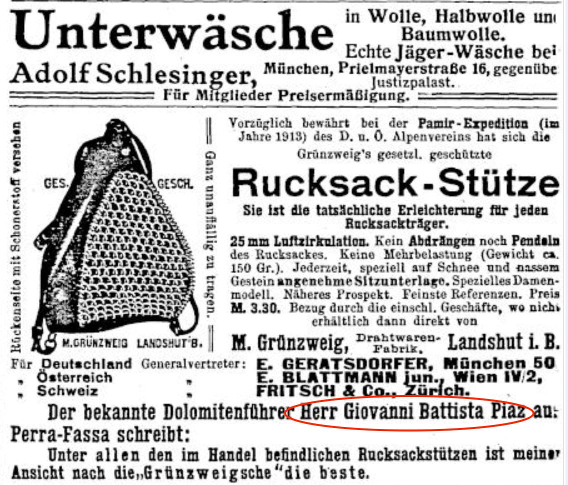 Starting in the fall, 1905 guiding season, Piaz began an incredible year of first ascents with Bernard Trier, a wealthy German industrialist and talented climber. In a single day they climbed three new spires in the Carnic region (the same area as Campanile di Val Montanaia in the Eastern Alps). When Piaz was guiding in the area, he hired the barefoot carrier Teresa, for whom Piaz named the descent notch Forcella Teresa. Piaz writes of Teresa: